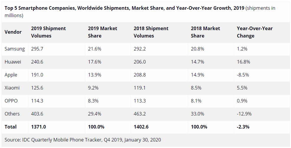 至于三星和华为,在2019年第四季度都出现了同比下滑,这显然跟小米和苹果在该季度出色的表现有关。尤其是华为,第四季度出货量为5620万台,同比下降了7.1%,这对于华为来说还是比较少见的。
