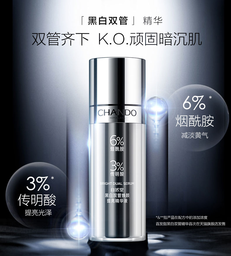 全新自然堂黑白双管焕颜提亮精华液,6%的烟酰胺和3%的传明酸加入,堪称史上最高浓度。双管活芯精华,黑管为白色精华乳,半月瓶白管为透明精华,1:3的科学配比,带来弱酸性温和呵护。
