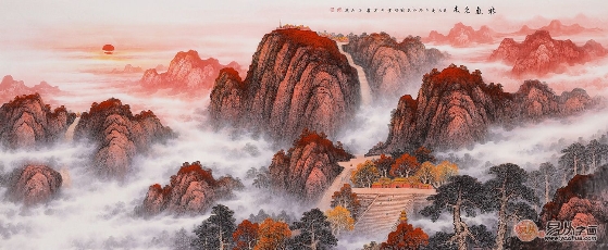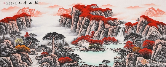 红色,从古到今都深受中国人喜爱。在中国人眼中,红色代表着喜庆、吉祥,同时也有一定辟邪之用。这幅蒋伟先生聚宝盆山水画,瞬间让人想起“霜叶红于二月花”杜牧的诗句,满山红叶犹如给山峰带了一顶红色帽子,正中“鸿运当头”之意,在风水中,聚宝盆寓意着旺财聚财之意。这样一幅风水字画,装饰在家居之中,红红火火,旺财运!
