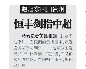 根据粤媒足球报的采访,贵州恒丰新回归的总经理赵旭东接受采访就表示,贵州本赛季的目标就是剑指中超。这在中甲队伍中是自深圳后,第二个提出来目标就是冲超的球队。上赛季贵州恒丰有很大机会冲超,但是最后功亏一篑。