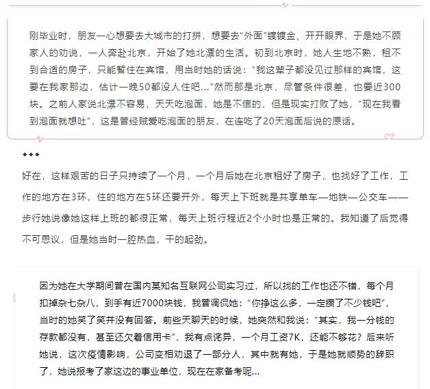 我很疑惑,她在北京的工作究竟有多不好,能让她一个曾经那么看不上事业编和公务员的人,决心报考。挂了电话后,我想了很久,从她的故事,想到自己的故事,或许安稳比钱多来的更重要吧......