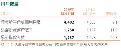 至2019年末,陆金所平台注册用户数4402万人。累计借款人为1237万人,较2018年增20.3%。至2019年末,陆金所控股管理贷款余额4622.43亿元,较年初增长23.3%。