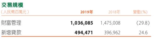 业绩报同时披露了陆金所控股多项业务数据。陆金所控股业务领域主要包括财富管理和个人借款。在个人借款领域,2019年,陆金所控股管理贷款余额涨幅超两成,达到4622亿元。在财富管理领域,财富管理业务交易规模和存量规模均下降。2019年,陆金所控股财富管理交易规模为1.04万亿元,同比下降29.8%。2019年末,陆金所控股资产管理规模为3468.56亿元,较年初降6%。