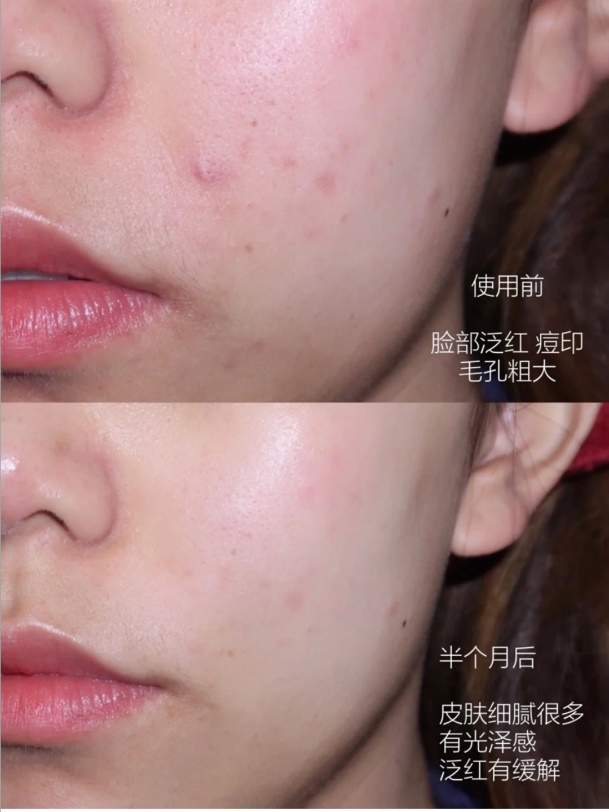 原本我脸上因为过敏而长的痘痘和泛红,在搭配索妮丝的紧致嫩肤修护乳、活泉水保湿修护喷雾,大概半个月后,脸部泛红的情况明显有了改善,也不再像之前那样又痒又疼。现在我早晚都在用索妮丝嫩肤紧致舒缓水和紧致嫩肤修护乳,在办公室一感觉脸上有点干,就喷一喷活泉水保湿修护喷雾,这样下来,一个多月,我的脸就回复到正常的皮肤了!
