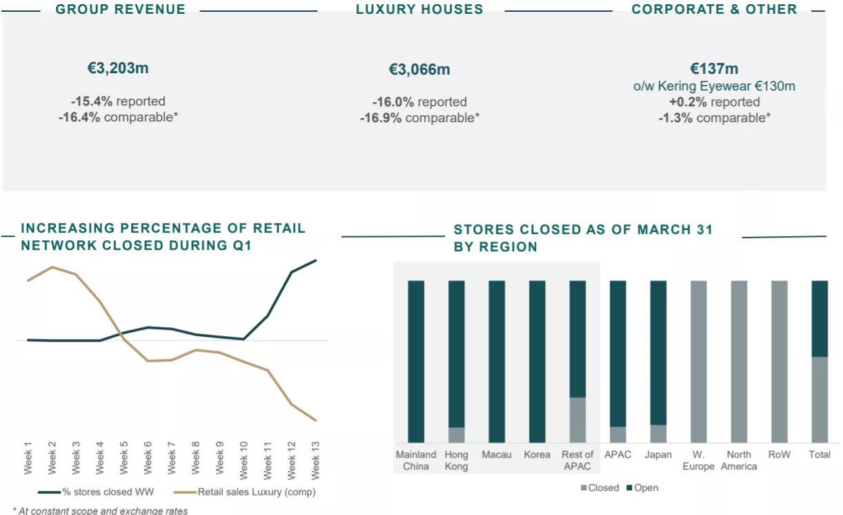 据时尚商业Daily,Gucci母公司开云集团昨日公布截至3月30日的第一季度业绩,受疫情影响,该集团收入同比大跌15.4%至32.03亿欧元,上年同期为大涨21.9%,
