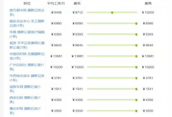 在看准网中搜索到关于摄影记者的招聘,需求量是非常大的,其月均工资在4000-5000元。在新媒体时代,引人注目的头图是赢得高流量的关键因素之一,抓拍一张构图得当的照片能使新闻变得抢眼,在这其中,摄影记者功不可没。