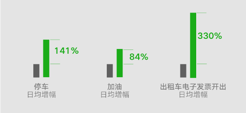 车主出行上,停车、加油的微信支付日均增幅分别达到141%和84%,出租车电子发票开票日均增幅330%。