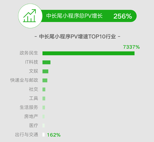 微信大数据显示,3月2日以来,新发布小程序总数月同比增长177%,较多属于商家自营、工具、生活服务行业。政务民生、IT科技、文娱等中长尾小程序总PV增长256%,其中政务民生行业PV增速高达7337%。