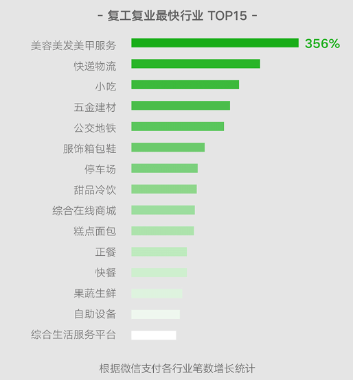 微信数据显示,相比2月同期,3月2日以来,美容美发美甲服务的微信支付增幅高达356%,成为复工后消费最活跃的行业。位列第二至第五的行业分别是:快递物流、小吃、五金建材和公交地铁。