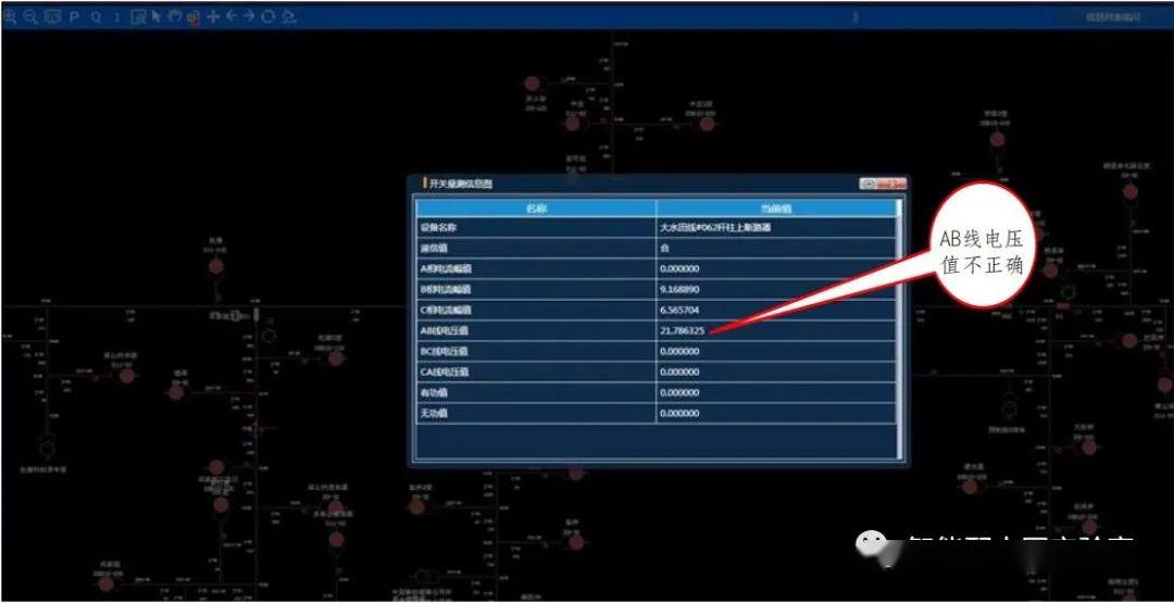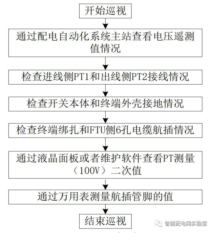 4.1现场巡视发现问题(如何发现问题)现场巡视时,采取“先在杆下后上杆”的巡视方式,巡视流程图如图11所示。具体步骤如下。图 11 巡视流程图第一步:可通过配电自动化系统主站查看电压遥测值是否正常。如图12所示。图 12 配电自动化系统主站查看电压遥测值情况第二步:针对电源侧,检查进线的A柱是否连接的A相线,B