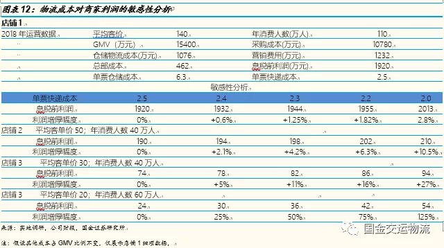 我们以四个不同客单价和销售量的淘宝店铺为例,模拟计算了单票价格下降对于商家利润的影响。根据草根调研的情况,义乌快递价格在日单量超过1000票(年销售量超过35万件)的情况下显著低于周边地区,差距一般可达03-0.5元/票。