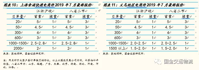 从草根调研情况看,以上海电商密集的青浦区为例进行对比:在日单量1000以下,快递公司给出的报价差异并不显著。而对于日单量超过1000票,均重0.5kg以下的客户,义乌快递网点给出的报价较上海青浦地区低约0.3-0.5元。(在义乌,首重1kg的价格参考有限,通常快递公司会进一步根据150g,500g和1000g不同重量段进行报价。这也从侧面反映了义乌快递竞争的激烈程度。)