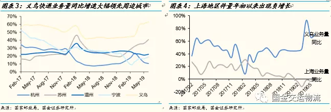 义乌市17年快递业务量同比增速保持在50%以上,18年同比增速下降至40%;19年4月份以来,义乌件量增速上升至60%,大幅领先于苏州、温州、宁波等城市。