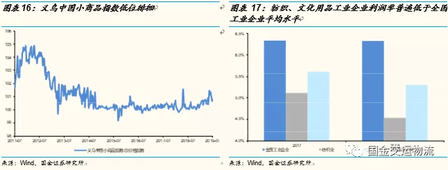纺织服装、文体娱乐用品等小商品的特质,决定了义乌商贸“低价走量”的模式。义乌小商品以小件纺织服装、小百货、日用品和部分文化用品为主,具有生产分散、品种繁多、消费变化迅速等特点,同时总体单价偏低,义乌中国小商品指数近年来始终处于低位徘徊。义乌当地的小商品制造企业的盈利模式基本为薄利多销、低价走量。以分行业工业企业的利润总额作为参考,纺织业、文化用品的利润率普遍低于全行业平均水平。