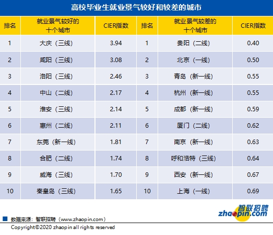 此外,根据智联招聘最新大数据,2020年一季度中部和东北地区的大学生CIER指数相对较高,而东部和西部地区的CIER指数较低。2020年一季度大学生CIER指数较高的城市为大庆、咸阳、洛阳等中部和东北地区三线城市,以及长三角、珠三角和东部沿海地区的二、三线城市,如中山、淮安、惠州、威海和秦皇岛等。而东莞作为新一线城市,大学生的就业形势也较好。从就业景气较差的城市来看,贵阳的大学生CIER指数最低。从期望就业城市来看,一线、新一线城市及部分省会城市成为毕业生首要选择。