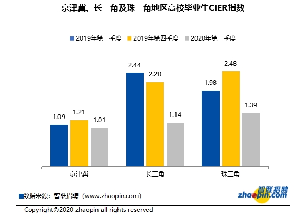 从重点地区大学生的CIER指数来看,京津冀地区大学生就业形势相对较差,长三角和珠三角地区大学生就业形相对较好。值得各位搜狐网友注意的是,京津冀地区的大学生供求变化与其他地区不同,无论是环比还是同比,其招聘需求人数和求职申请人数均有所下降;而长三角和珠三角地区的招聘需求人数明显下降,但求职申请人数在增加。因此,京津冀地区大学生CIER指数降幅相对较小,长三角和珠三角地区降幅相对较大。
