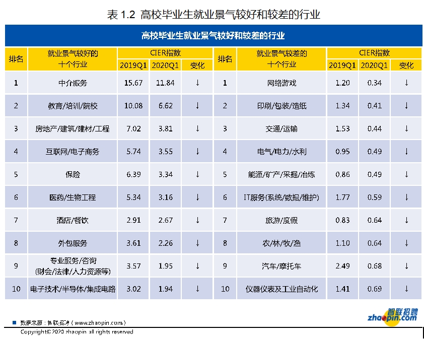 根据智联招聘大数据,2020年一季度,全国数据中CIER指数最高和最低行业之间的差别倍数为17倍,大学生群体则高达34.8倍。高校毕业生就业景气较好行业排名与全国基本一致,但排名略有差异,分别为中介服务行业、教育/培训/院校、房地产/建筑/建材/工程、互联网/电子商务、保险业等。