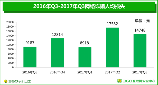 而据360手机卫士新近发布的《中国2017年Q3手机安全状况报告》显示:2017年第三季度,猎网平台共接到来自全国各地的网络诈骗举报6172起,同比增长24.8%,涉案总金额高达9102.4万元,人均损失为14748元。