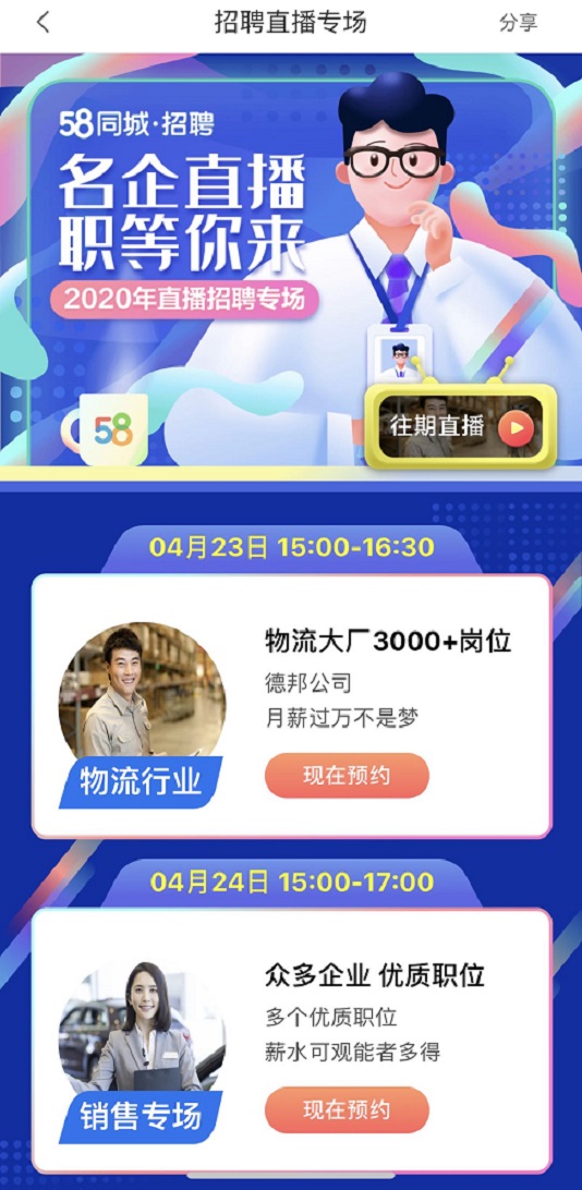 用户登陆58同城APP,点击全职招聘页面,即可看到直播招聘专场活动。在此次直播招聘专场中,58同城用户可进行提前预约,锁定感兴趣的企业、岗位,准时收看精彩直播内容,了解丰富的岗位资讯。同时,58同城用户还可将直播预约链接分享给亲友,使更多人收看直播招聘。
