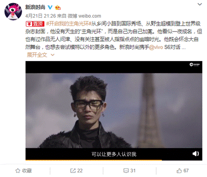 最近,vivo S6正在与年轻人一起打造关于“主角光环”的故事,新浪时尚官方微博也在4月21日发布了一段时尚短片,短片中的主角是被称为“野生超模”的陆仙人。