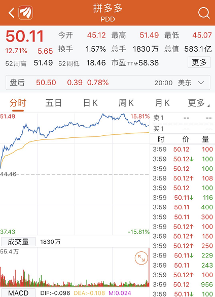 首次影响,拼多多盘中一度大涨近16%,截至收盘,涨幅有所收窄,上涨约13%,报收50.11美元,创历史新高。