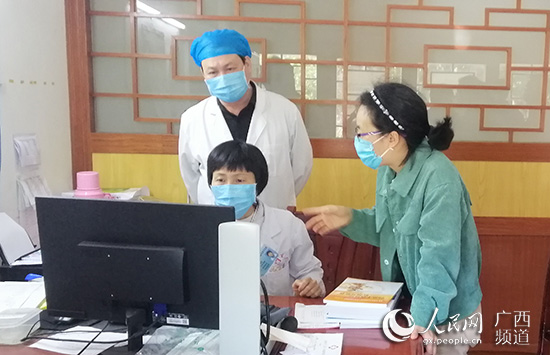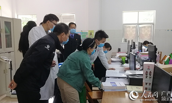 市场监管部门工作人员在乡镇医疗卫生机构现场指导不良反应监测(事件)工作。北海市市场监管局供图