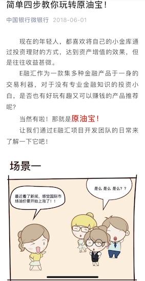 此外,与产品协议不同,银行对于相关产品的宣传资料中时常包含一些夸张的宣传语,例如中行在官方微信公众号此前发布的一篇文章题为“简单四步教你玩转原油宝”,其中提及——“E融汇作为一款集多种金融产品于一身的交易利器,对于没有专业金融知识的投资小白,是否也有好玩有趣又可以赚钱的产品推荐呢?当然有啦!那就是原油宝!”
