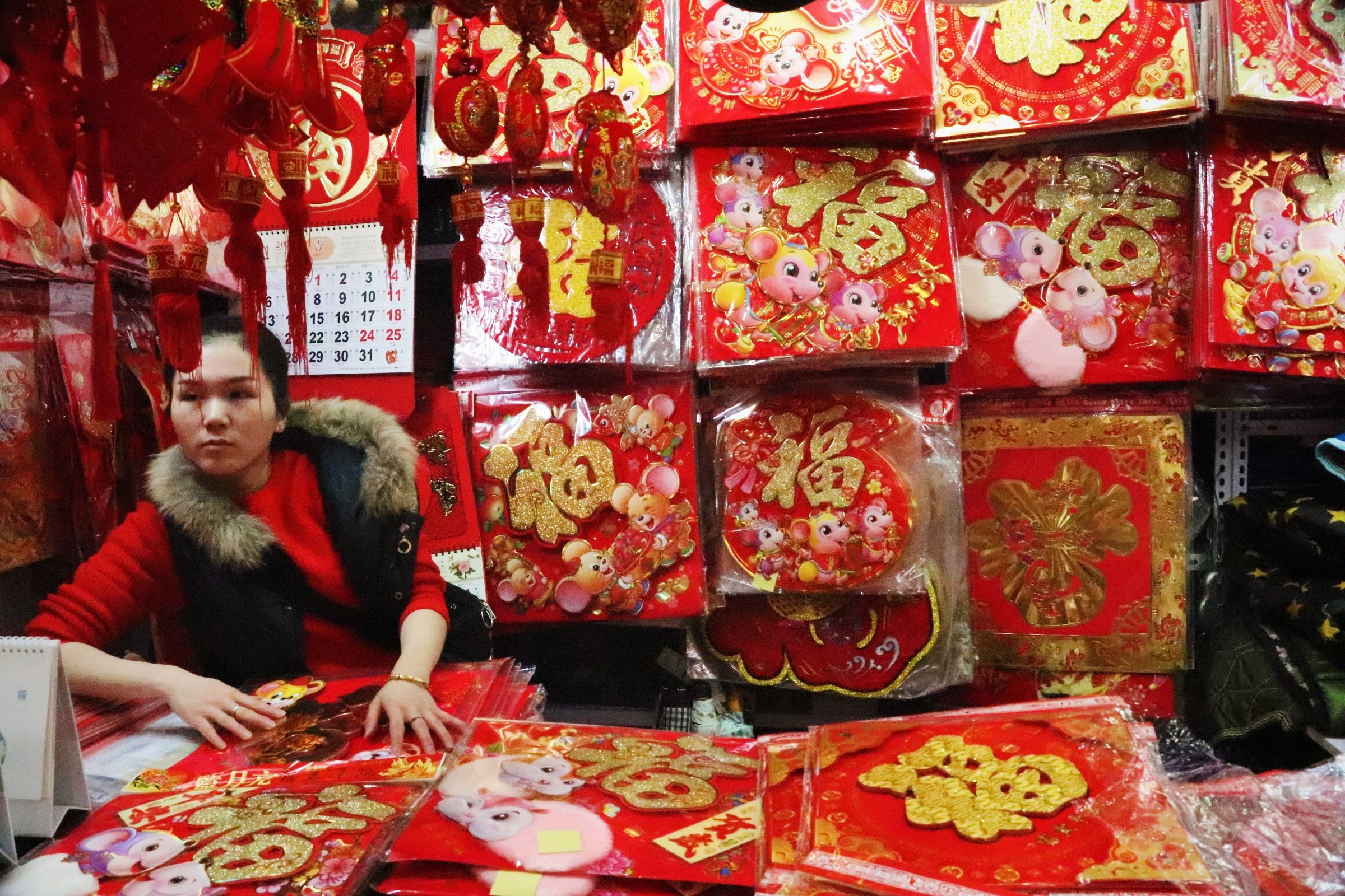 进入大门,左右两侧都是手机维修贴膜的摊位,一层摊位主要以珠宝首饰、鞋帽箱包、纺织品为主,个别摊位售卖五金、毛巾等,临近新年,卖福字对联的摊位生意也不错。二层主要是服饰,有商户正踩着缝纫机,给客人的衣服纤边儿、修拉锁。小摊位排列紧凑,商品应有尽有、琳琅满目。货品样式不算新潮,但是却物美价廉,符合老百姓的生活需求。