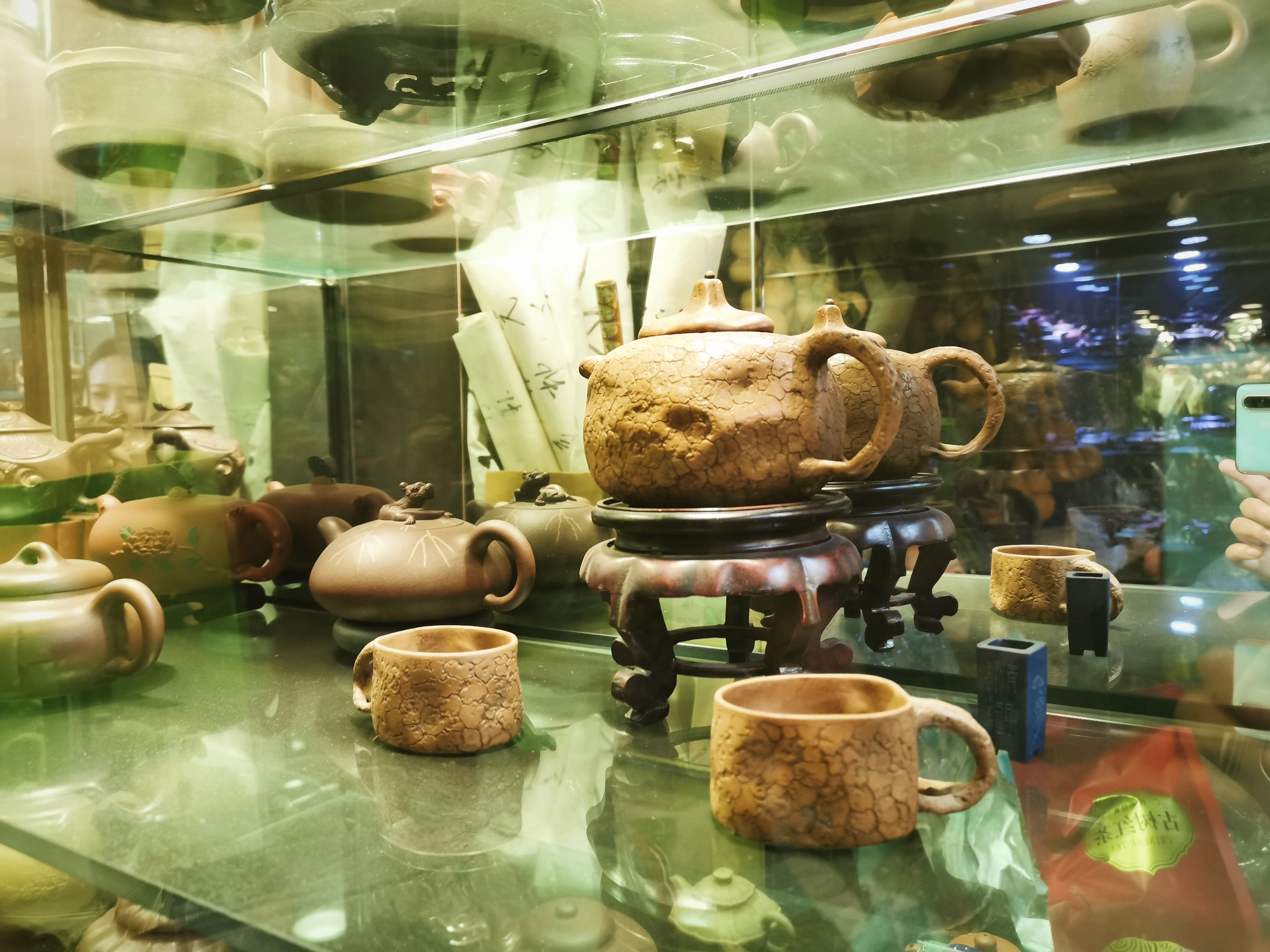 在展示柜中,放着吴小芳的嫁妆,一套清代的紫砂壶。她说,南城是北京的文化聚集地,有“文”又有“武”,琴棋书画、曲艺戏剧,应有尽有。10年前,吴小芳的店铺获得了报国寺收藏市场的十佳店铺,市场特意找来了摄影师给吴小芳拍照片,她拿着紫砂壶,眼中满是欣喜。