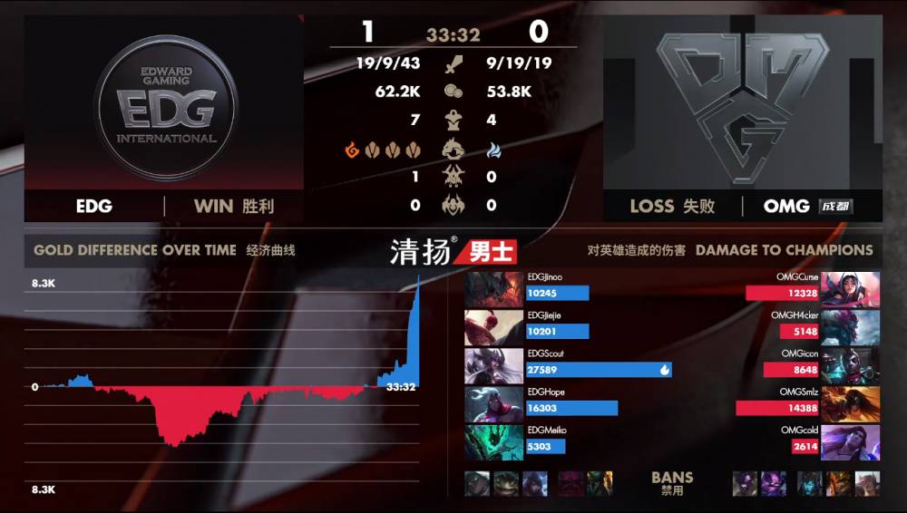 【32:50】OMG中路希维尔开启大招五包二击杀锤石,随后开启大龙,EDG四人来守盲僧进场抢下大龙,随后团灭OMG结束比赛。