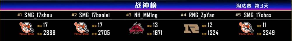 今日战神榜方面,SMG三人上榜,17shou以17次击杀排名第一。