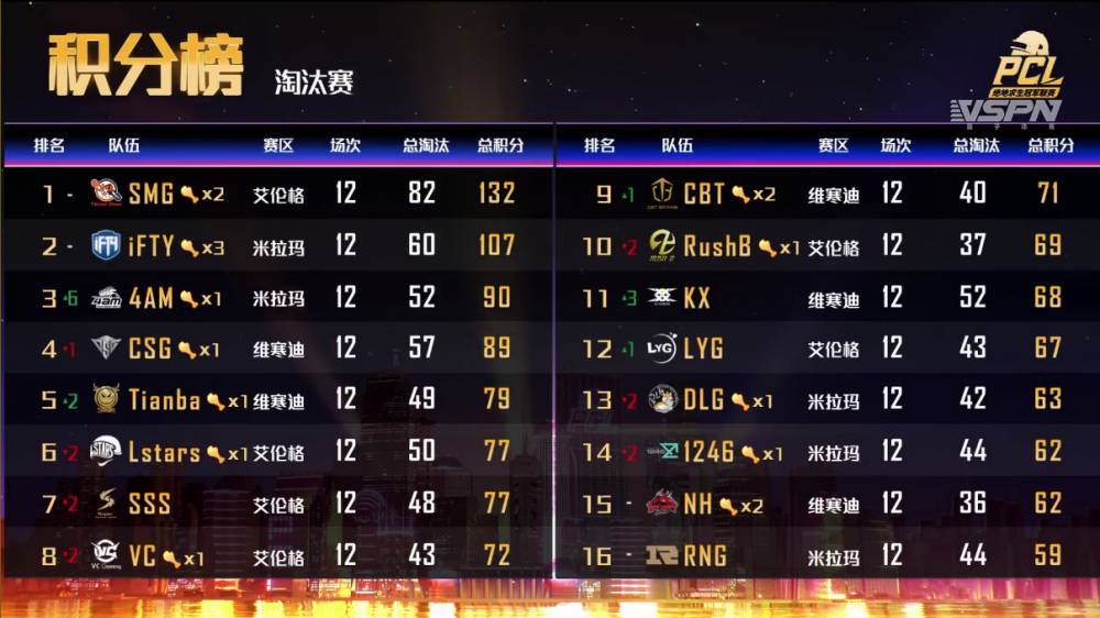 4月23日讯 PCL季后赛今天结束了淘汰赛的所有比赛,SMG在今日的比赛中拿下83分,总积分132分排名榜首。iFTY总积分107排名第二,4AM则是今日拿到55分,以90分排名第三。