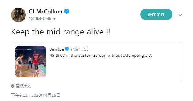 CJ转发乔丹季后赛无三分砍49分&63分表现:中投不死!2020-04-20 16:03:40 Twitter4月20日讯 乔丹纪录片《The Last Dance》今日正