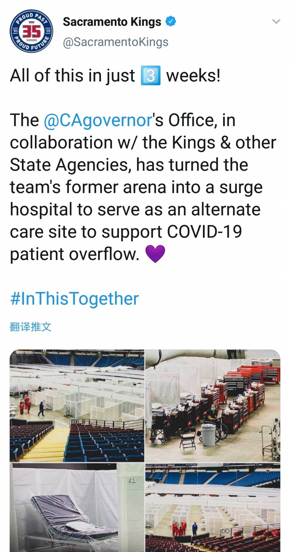 国王队官推写道:“所有的这些仅用时3周!我们联合萨克拉门托市政府以及其他的一些部门,将球队之前的球馆改造成了一个临时医院,用以收治得不到及时治疗的新冠患者。”