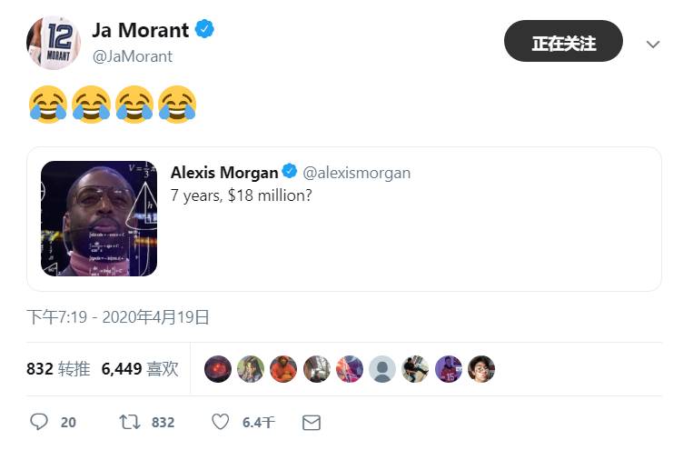 著名媒体人Alexis Morgan借用韦德经典表情包感叹,随后莫兰特转发并配上“笑哭”的表情。