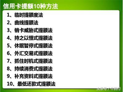 方法:致电24小时服务热线,并按要求提供有关材料。临时信用额度有效期最长为3个月,到期后您的信用额度将自动恢复为原来的额度。(注意:有关材料很关键,这是补足你申卡时候基础材料的一大机会,里面尽量显示你的财产、信用寄经济能力。)下面是你申卡的一些得分项,相应的进行补充。