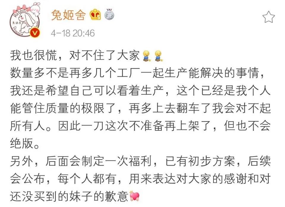 明明借势抖音、小红书等新传播渠道,三坑市场呈现急速增长。然而,即便是最接近常服的JK制服,多数商家也仍沿用早期的小作坊批量生产,惹得“工期消耗热情”“预售使人暴躁”的抱怨不断。兔姬舍提前切团,就遭到了买家质疑和不满。可有趣的是,吐槽归吐槽,相关制服店铺的粉丝量、销售额依旧美丽。