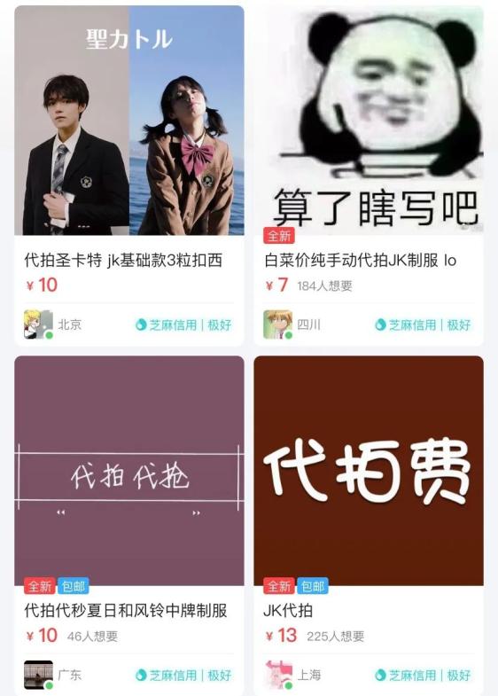 当然,卡秒抢团也未必能在激烈竞争里杀出重围。除了遵循各种抢拍指南,疯狂提高网速、手速外,姐妹们还养出了一批JK制服代拍业务。在闲鱼上,我们可以看到大量均价10元/次的代拍服务,评论区里挤满了“今晚x点接吗”“xxx可来?”的咨询。