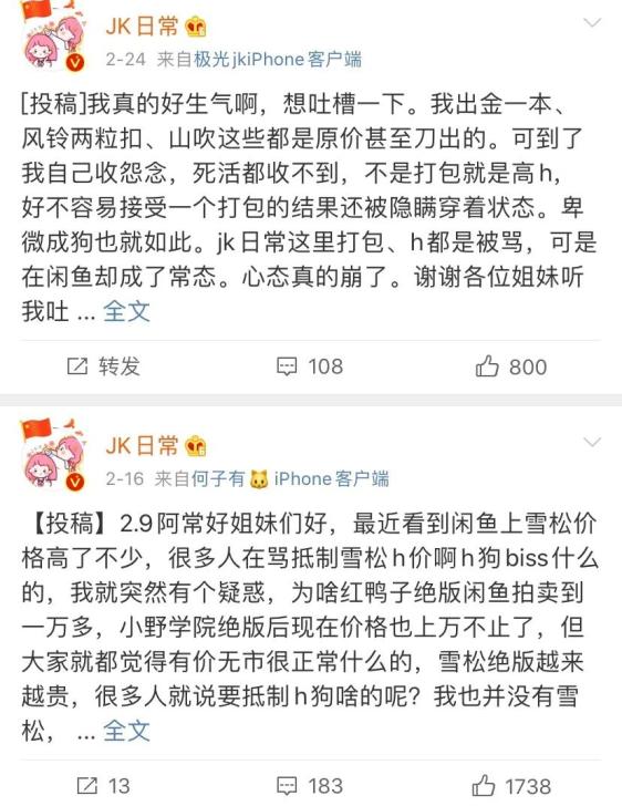 相较于常服,JK制服的二手市场有着严格的交易制度(没说严格不好)。潮玩、潮鞋同为小众圈层,都刮起过“炒股”之风,限量溢价动辄成千上万。可你要是拿着JK制服玩溢价,很可能换来H(high)狗之称。在树洞微博JK日常里搜索“H”“打包”等关键词,就会看到大量避雷预警。