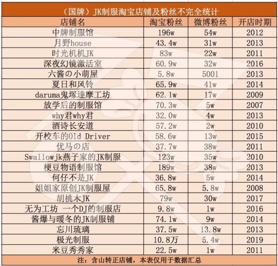 高涨的声量为JK制服产业带来了不小的消费增量。据硬糖君不完全统计,淘宝粉丝超50万的制服店铺有十多家,中牌、燕子家、梗豆甚至突破百万。