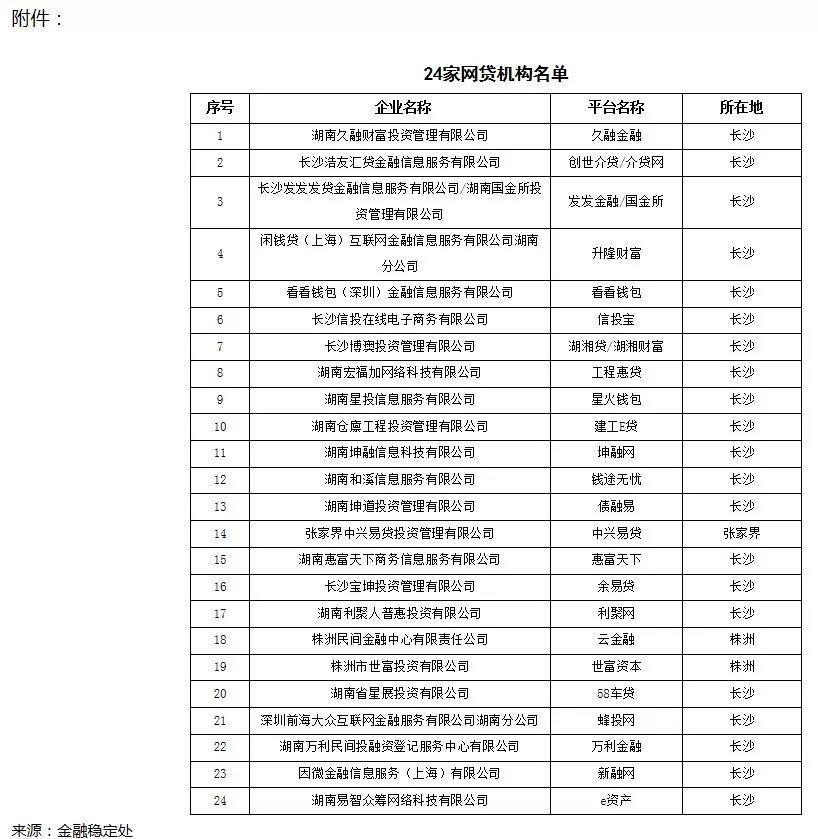 湖南省纳入行政核查的24家网贷机构P2P业务被取缔,以及未纳入行政核查的也一并取缔其在湖南省的P2P业务。