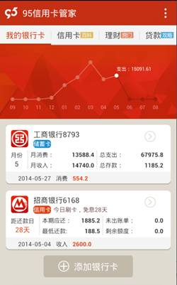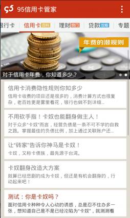 上海某调查机构对上海市内信用卡使用者开展的调查显示,有26.4%的人承认自己每月薪水用到1元不剩,是典型的“月光族”。并且由于对消费、收入以及负债不能很好的调节,有32.5%的人担心自己会因为过度消费而步入“卡奴”行列。如果你不想成为卡奴,安装95信用卡管家,帮你从卡奴变成卡神。