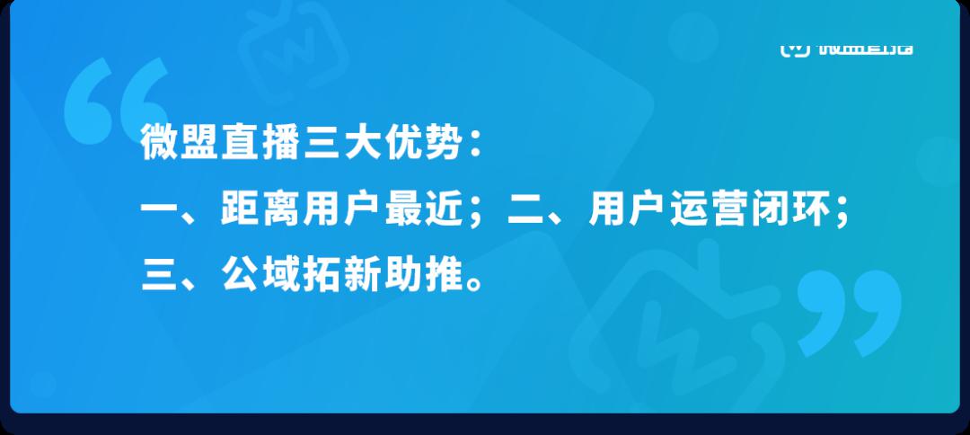 这一页上面,就是我刚才所提到的微盟的直播三大优势的一个汇总,离用户更近,整个直播间里面有大量运营工具,可以在直播的前中后分别进行流量的蓄水,最后就是可以对接整个公域进行直播获客。