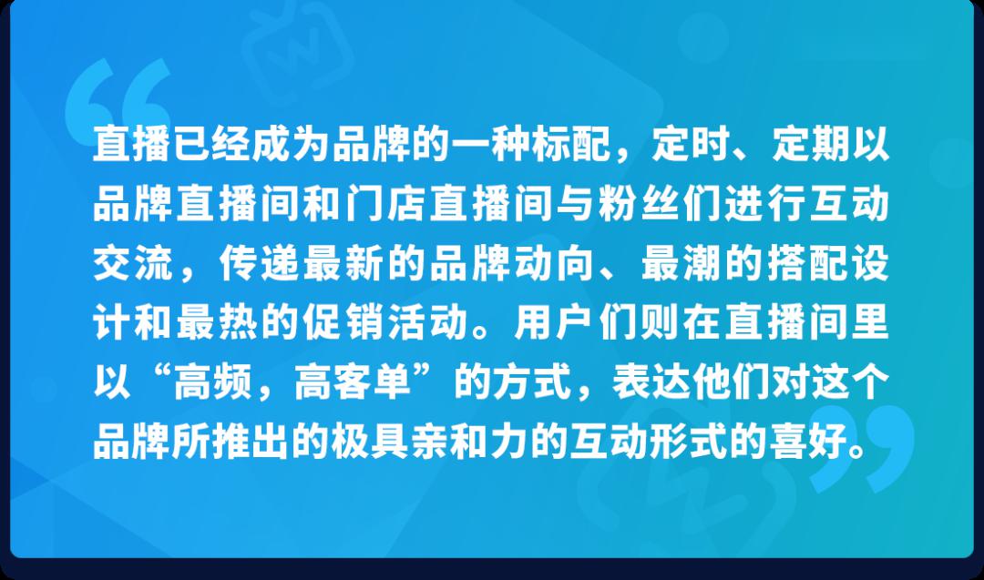 我们观察到,这些品牌目前已经将直播成为了一种标配,定期以品牌直播和门店直播的形式与品牌的粉丝们进行互动、交流,传递最新的商品动向,最潮的搭配设计和最热的促销活动。用户的喜好程度又是怎么样呢?我们观察过一组数据,通过直播间所产生交易频次、交易客单都会远远高于商城的带货能力。所以对于一个用户来说,当他要决策购买,或者对一个商品进行种草的时候,用户更喜欢直播这种具有亲和力的售卖方式。