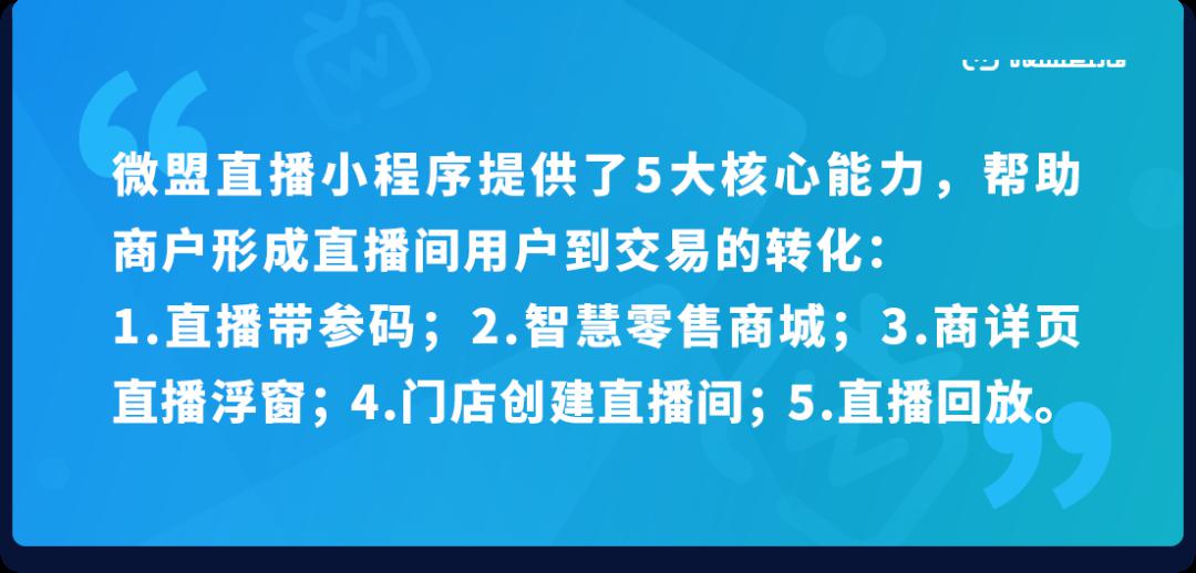 最后一个是直播的回放功能,一则好的内容,它的整个传播的时效性是非常长尾的,直播后的余温也可以进行持续发酵和生长,因此微盟直播间里面我们也推出了直播回放的功能,让一场优秀的直播持续进行转发,用户也可以在余温里面继续看到这些内容并进行购买。