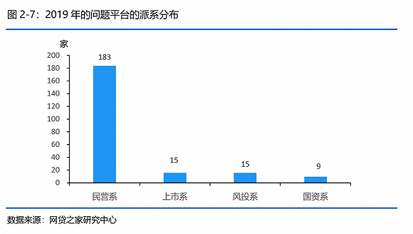 其中,民营系问题平台数量最多,高达 183 家,一是因为民营系平台无股东的资金和资源上的支持,二是其自身平台数量基数较大;其次是上市系和风投系分别有15家;国资系 2019年出现问题的平台数量最少,仅9家。