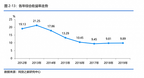 2019 年网贷行业综合收益率继续小幅回升总体综合收益率为 9.89%,相比 2018 年网贷行业总体综合收益率上升了 8 个基点(1 个基点=0.01%),主要原因在于 2019 年上半年几家大平台出现爆雷,为避免出借人信心不足资金大幅度流出,不少平台为提高出借人留存率,进行了加息活动。