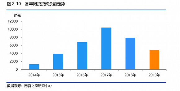 随着成交量逐步下降,网贷行业贷款余额也同步走低。截至 2019 年底,网贷行业总体贷款余额下降至 4915.91 亿元,同比 2018 年下降了 37.69%。