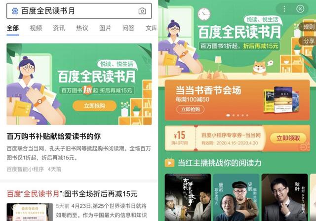 拥有了经过市场验证的模式后,本次全民读书月活动中,百度智能小程序也进一步联合了当当网、孔夫子旧书网等,为全网用户提供小程序购书服务,丰富自身的服务属性。