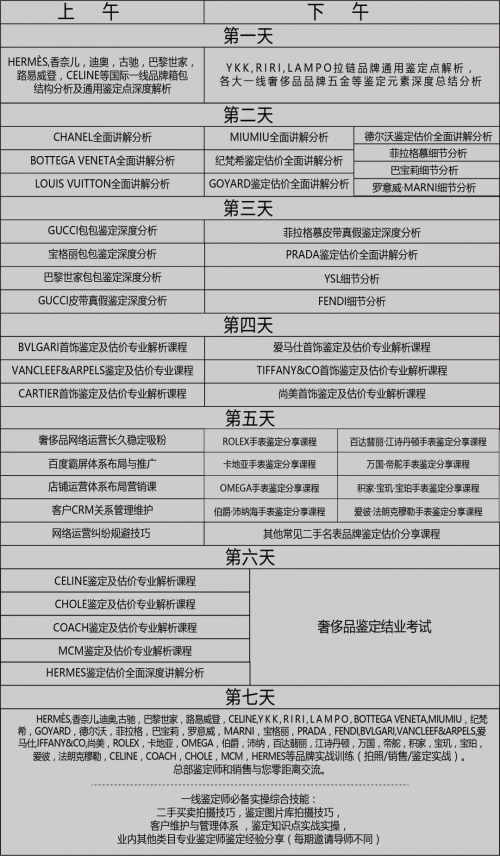 安洁利品牌创始人雷雨春,主讲第一天的课程,从爱马仕/香奈儿/迪奥/古驰/巴黎世家/路易威登/香奈儿等市场流通率高的一线国际大牌做工构造入手分析,深度解析他们的通用鉴定点,深度总结五金板块的鉴定元素,对一线奢侈品牌的专用拉链YKK/RIRI/LAMPO进行专题分析,逐个突破。
